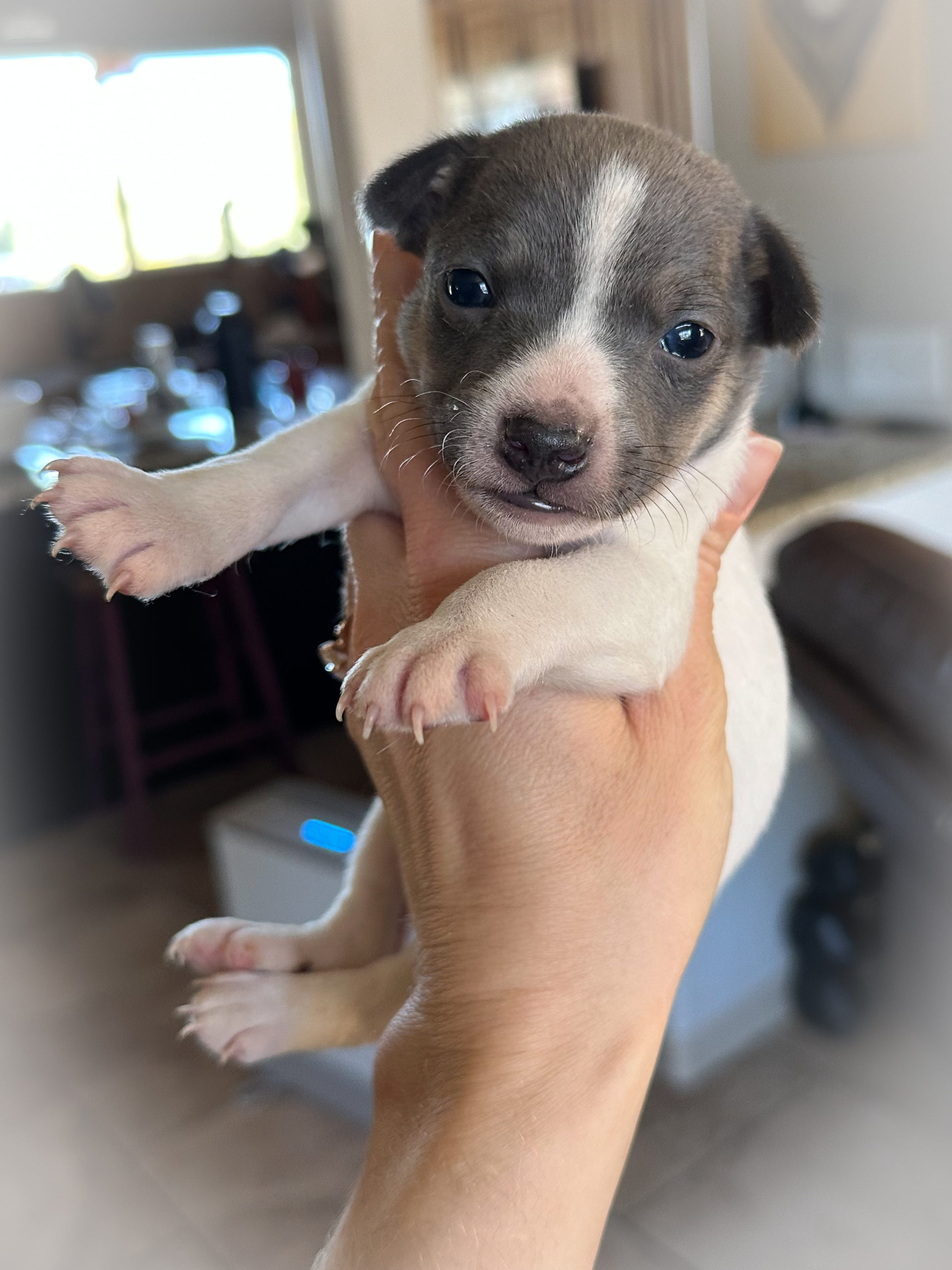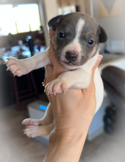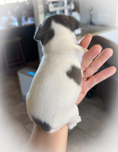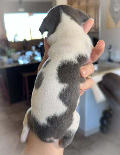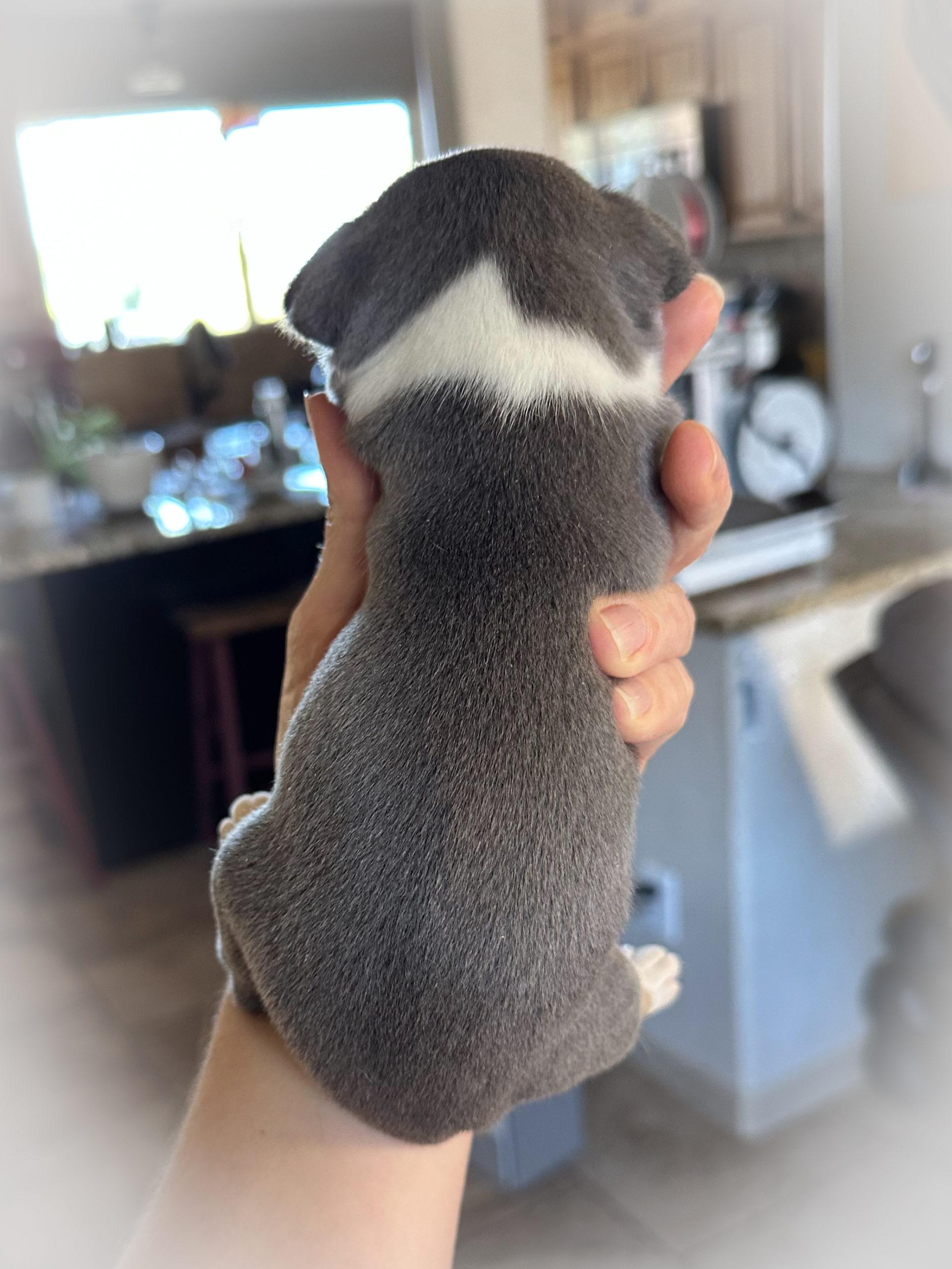 We can get blue tri or fawn tri puppies in this litter and we expect 75% to be blue tris and 25% to be fawn tris. We also have 50% chance of both Irish (tuxedo) and Piebald (primarily white with patches) for patterns.