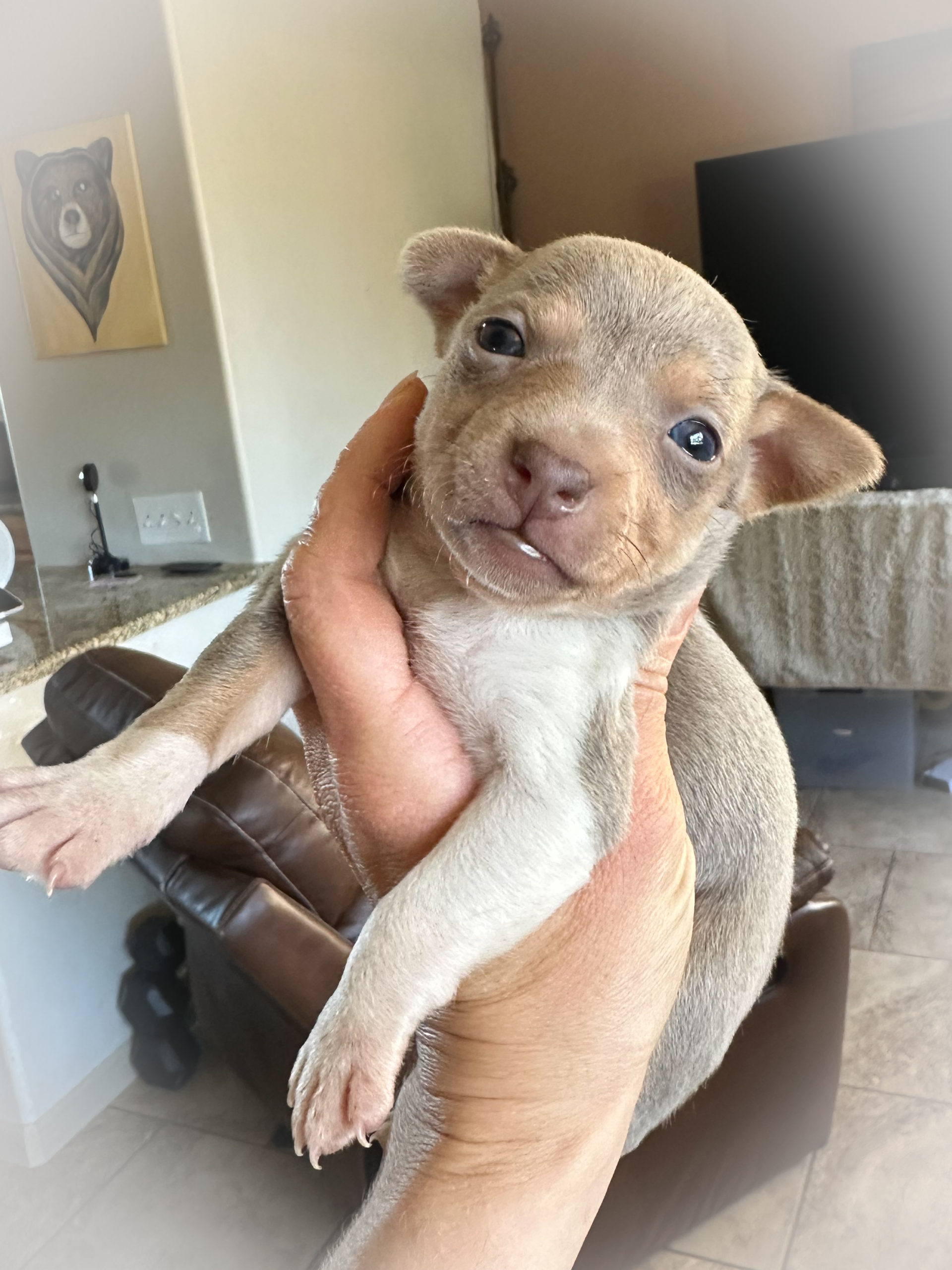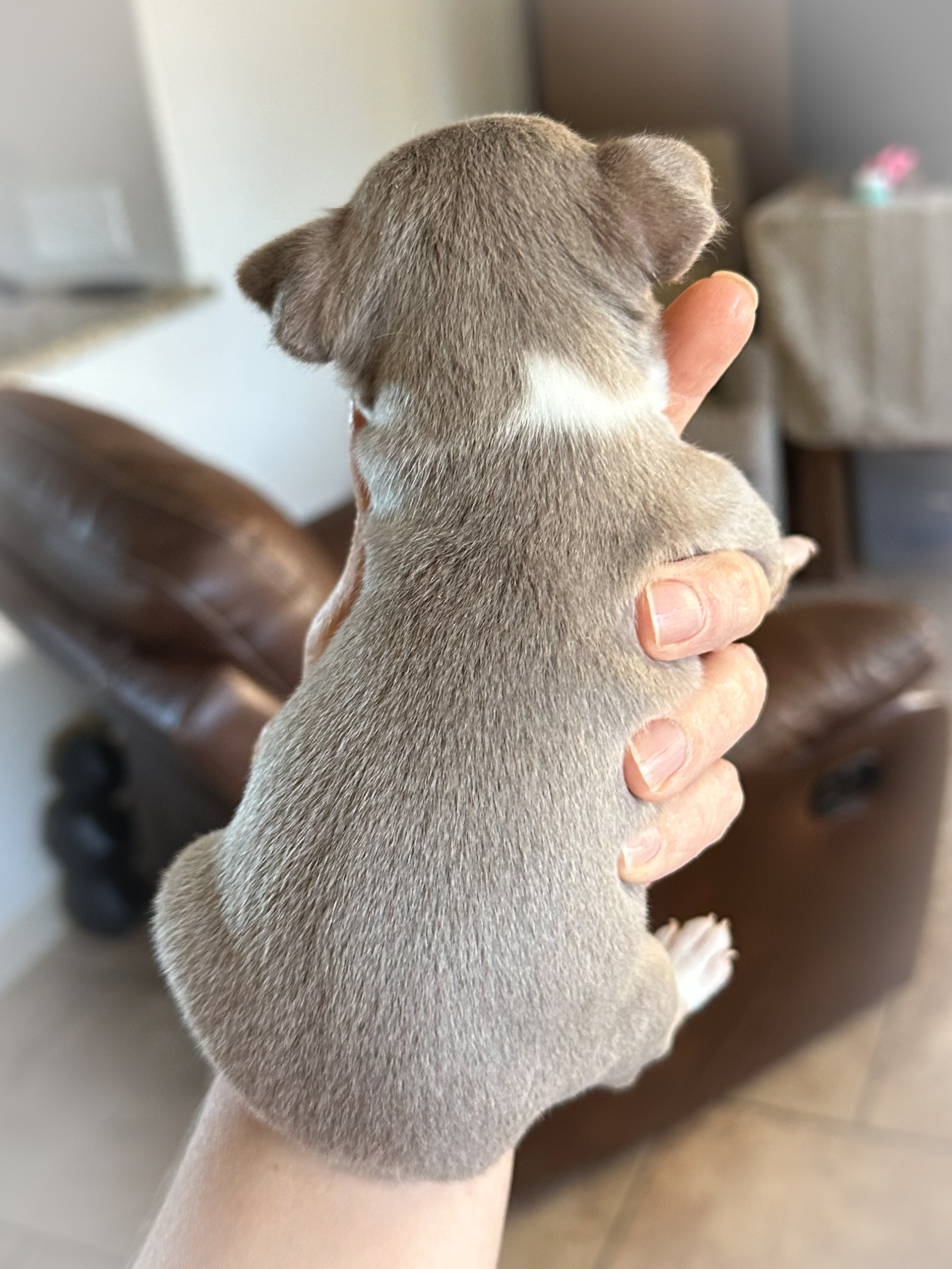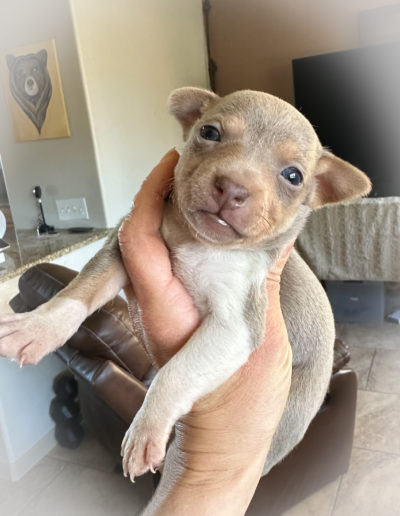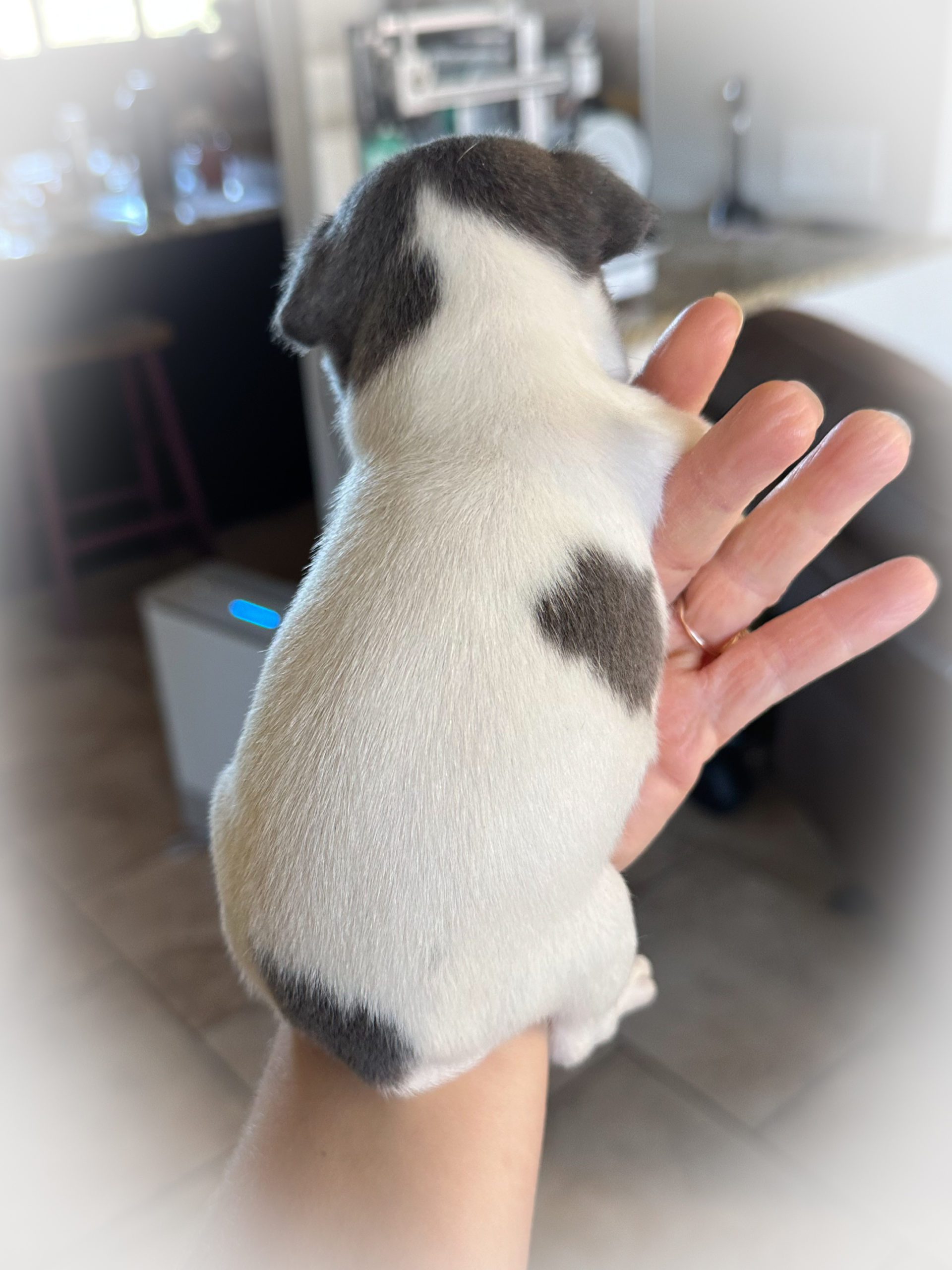 We can get blue tri or fawn tri puppies in this litter and we expect 75% to be blue tris and 25% to be fawn tris. We also have 50% chance of both Irish (tuxedo) and Piebald (primarily white with patches) for patterns.