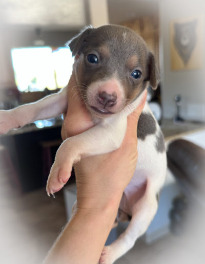 This is our smallest breeding pair. We expect mini and standard Rat Terrier pups in this litter. The girls will be 10-13″ at the shoulder, while the males, 12-15″ at the shoulder. Weights will vary from 12-18 lbs.